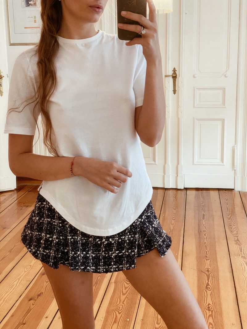 Zwykły, ale niezwykły tshirt. Dłuższe rękawki wysmukłą ramiona. Dół wycięty tak samo z przodu i z tyłu.