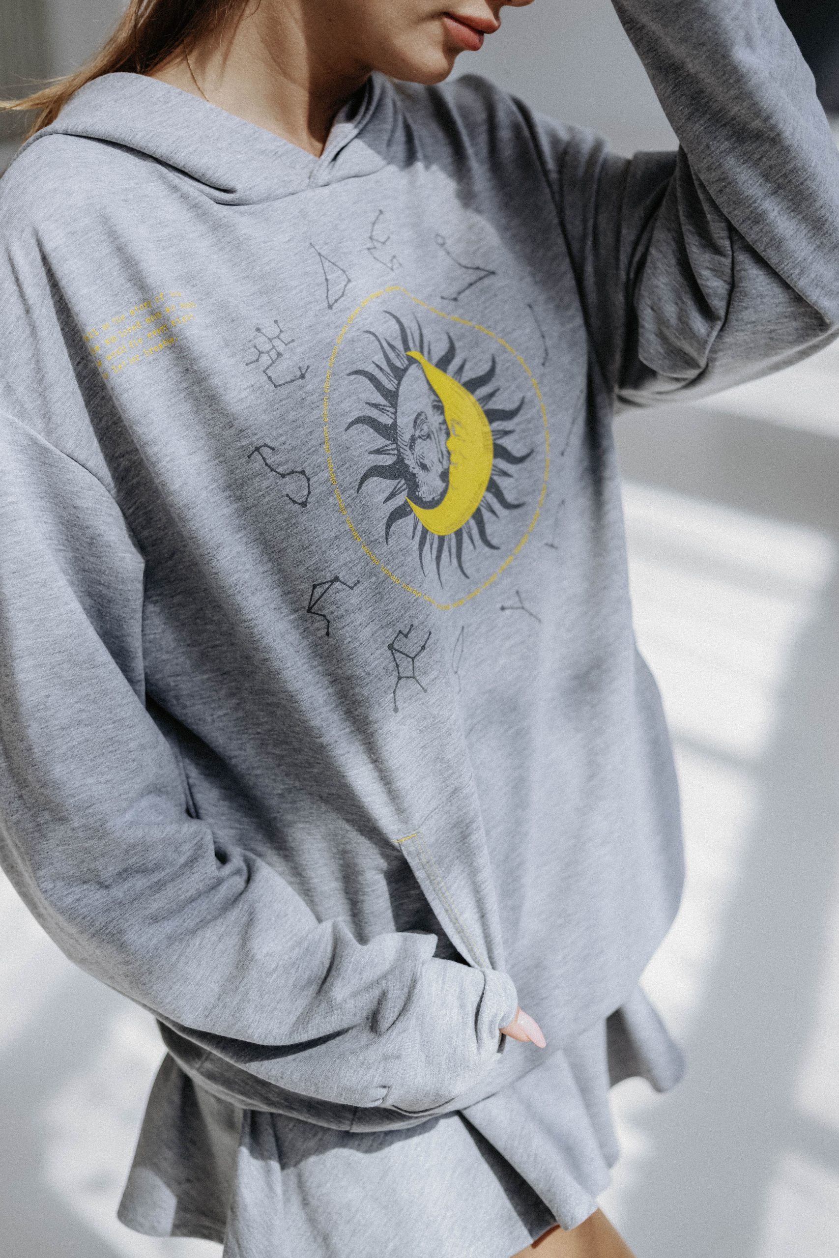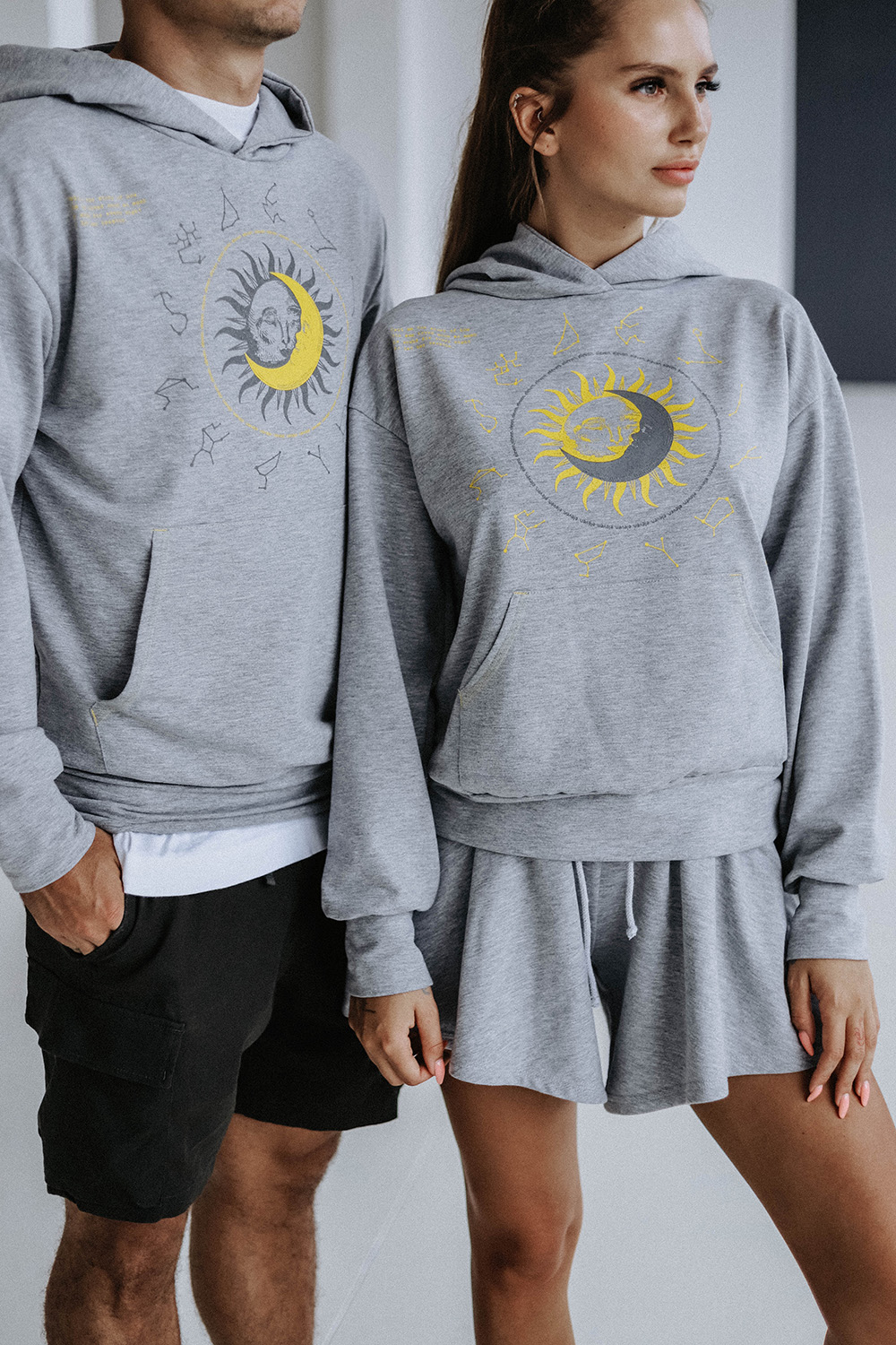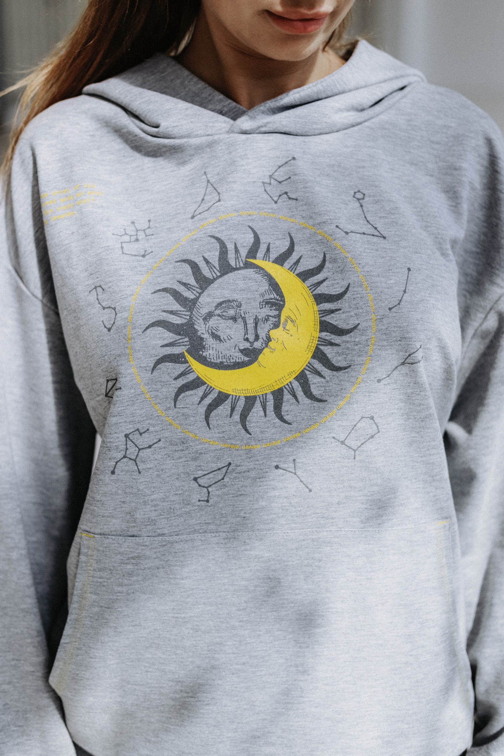 Klasyczna, szara bluza z kapturem, typu kangurka, z obniżoną linią ramion. Grafika nawiązująca do energii Księżyca, wpływającej nie tylko na naturę czy przyrodę, ale i na nas samych. Moc Księżyca potęguje nasze wewnętrzne siły, wzmacnia Najwyższe Jestem i energię jednostki. Energia Słońca i Księżyca jest jak dzień i noc, ying i yang – to przeciwności…