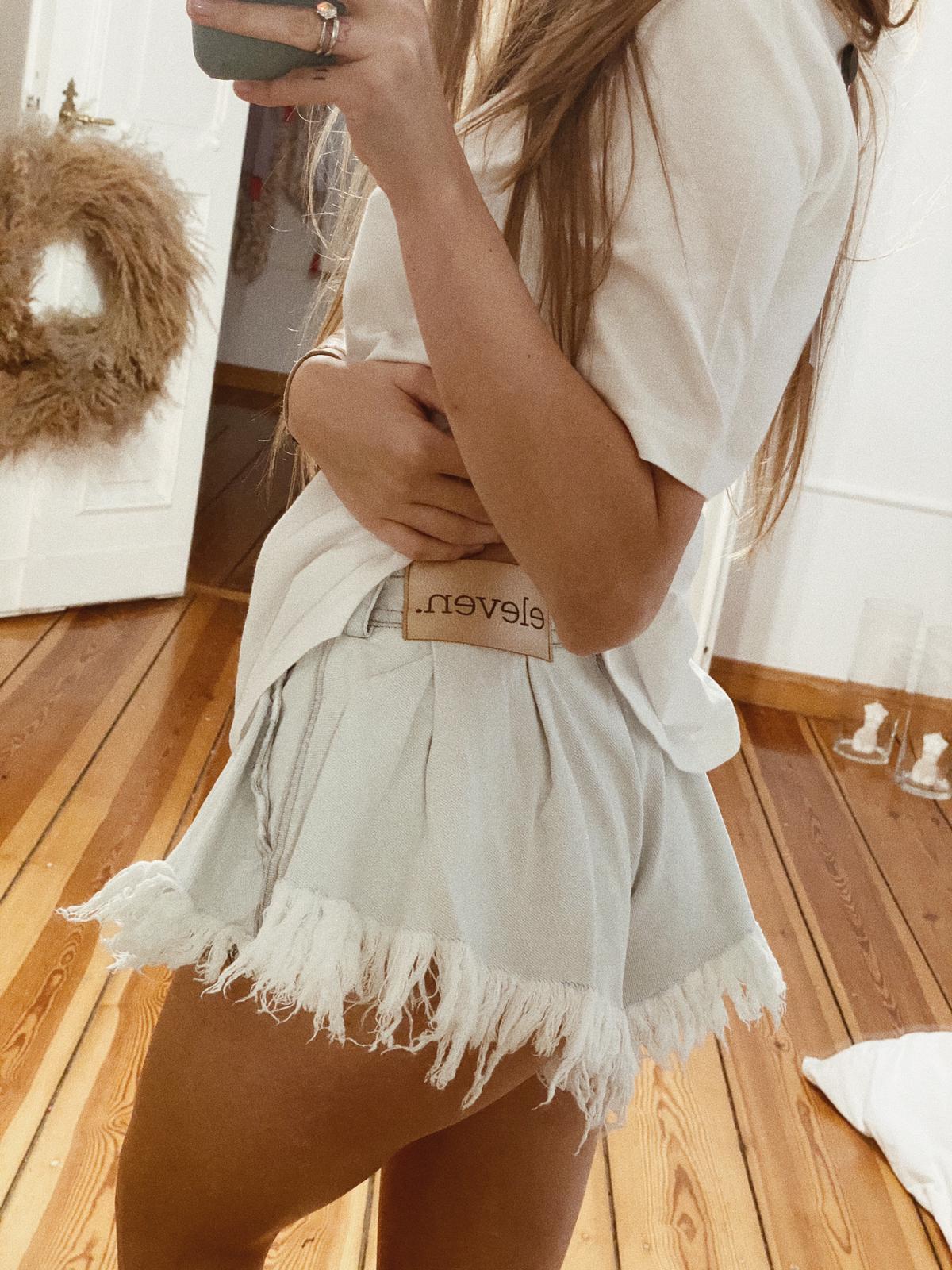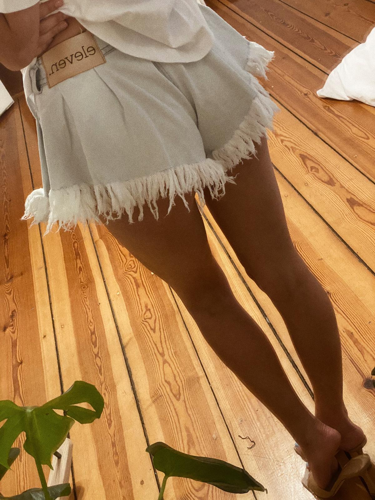 Spodenki jeansowe o szerokim kroju, poddane spieraniu oraz postarzaniu. Delikatny błękitny kolor.